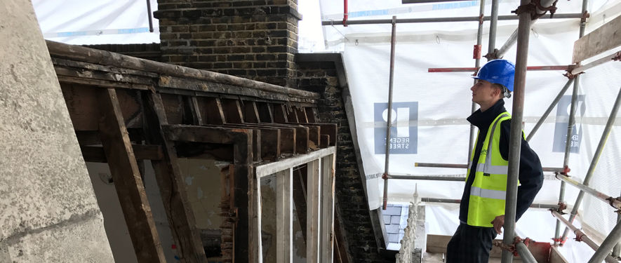 Externally, the façade, roof, and chimney stacks were refurbished. Full access scaffolding was erected and a temporary roof installed to protect the building during the works.