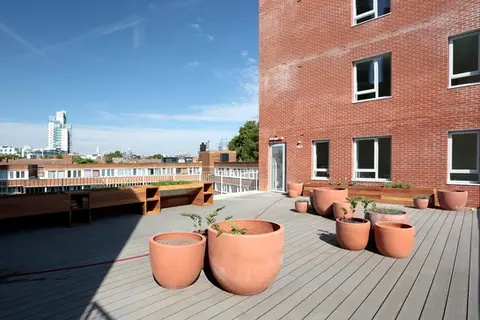 A 27-unit building that has been designed to offer maximum daylight with a number of eco-features, including enhanced building fabric, combined heat and power boilers, photo voltaic panels on the seventh-story tower, and a green roof on the fifth.